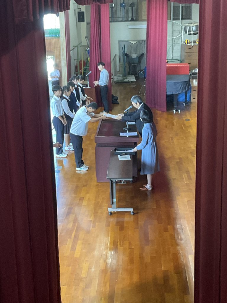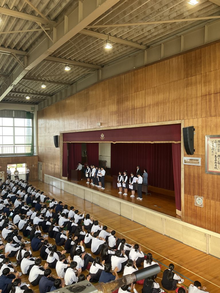 学校生活/学校生活(1年生)/学校生活(2年生)/学校生活(3年生) 後期生徒会認証式・部活動表彰 2025年10月10日 後期生徒会役員の認証式を行いました。新たに生徒会役員に選ばれた4名が認証され、新生徒会長があいさつをしました。これからよろしくお願いします。 認証式のあとは部活動表彰を行い、多くの部活動が表彰されました。表彰されたのは女子ハンドボール部、女子バスケットボール部、陸上部、男子ソフトテニス部、女子ソフトテニス部、水泳部です。また、女子バドミントン部は県大会に出場し、陸上部は東海大会へ出場しました。表彰された部活動のみなさん、おめでとうございます。